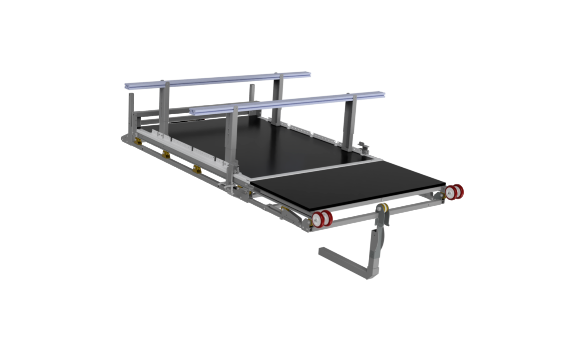 Bed Slide: with the roller latches engaged, the loader will extend straight out of the bed instead of tipping down and unloading. This transforms the platform into a bed slide and mobile work bench.
